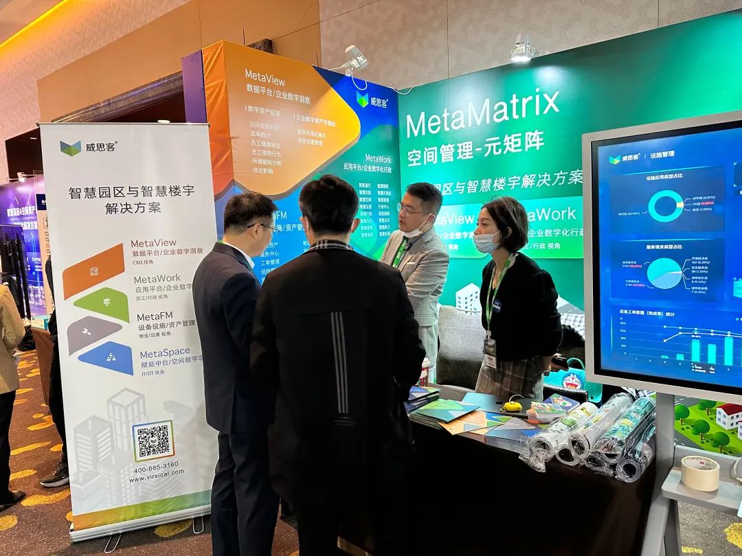 此次展会中,威思客围绕双碳主题,展出全新MetaMatrix系列方案。MetaMatrix是面向商业地产智慧楼宇管理的系列方案,包括:面向IT/OT的MetaSpace空间数字孪生赋能中台;面向企业员工、访客及行政办公管理的MetaWork企业数字化行政业务应用平台;面向企业管理驾驶舱及互动大屏的MetaView企业数字洞察数据可视化及分析平台;面向建筑楼宇物业运维的MetaFM解决方案。